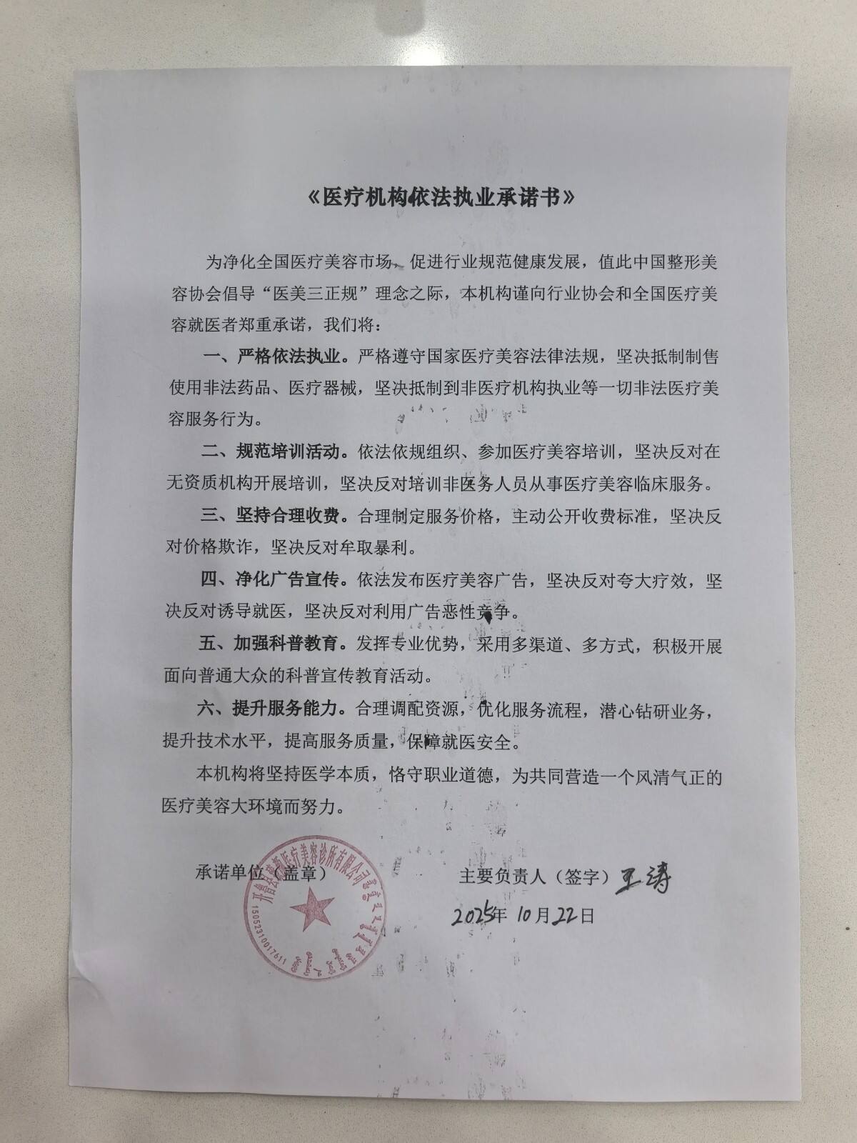 医疗机构依法执业承诺书: