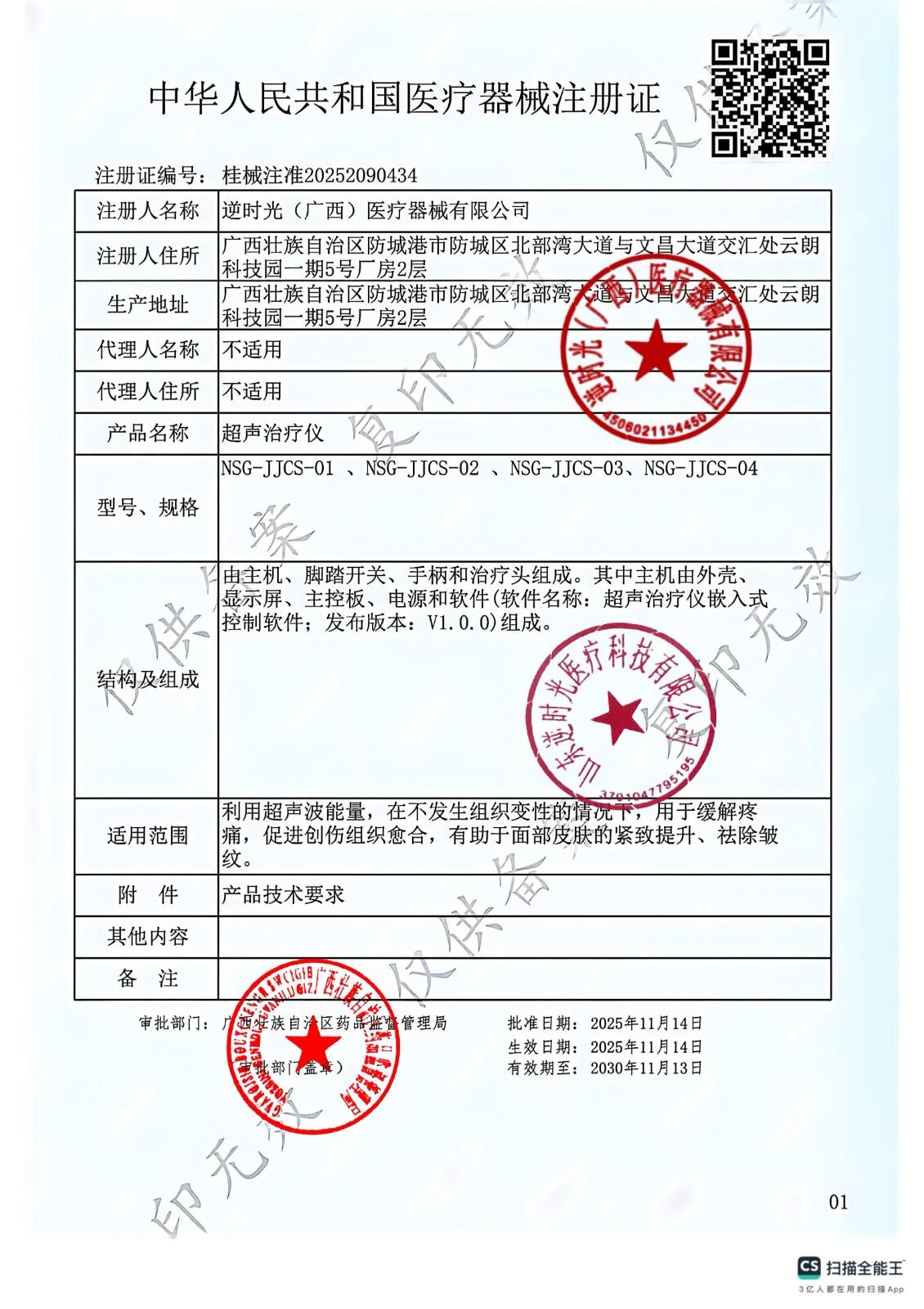 由逆时光(广西)医疗器械有限公司研发的超声治疗仪——荣获中国NMPA权威认证,具有紧致提升、祛除皱纹,合规医美适应症的超声治疗仪。作用原理:采用聚焦超声技术,将超声能量多点靶向聚焦在皮下SMAS筋膜层、脂肪层、真皮层,60-65℃的黄金治疗温度在皮下形成一个微细热凝固点,刺激胶原蛋白、弹力纤维新生和重组,具有紧致提升,祛除皱纹的功效。