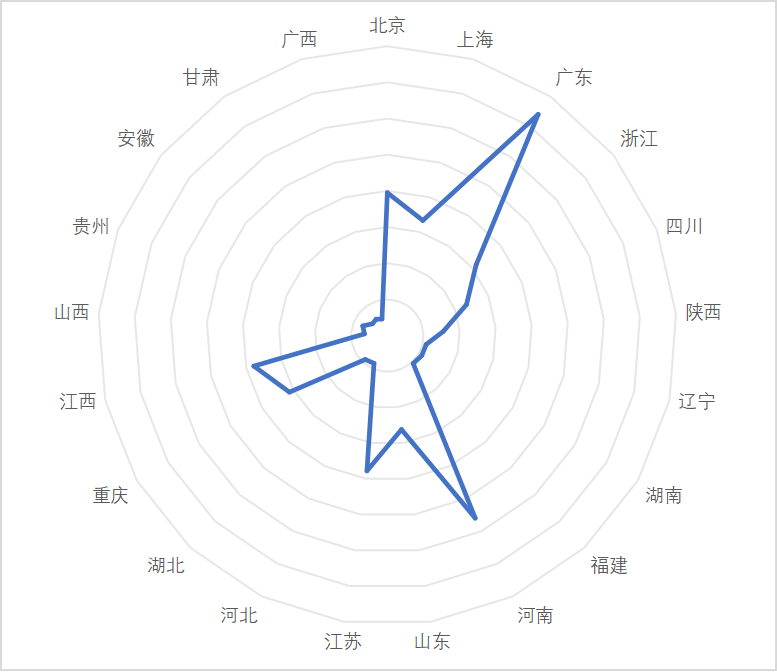 其中广东、河南和北京占据前三位。