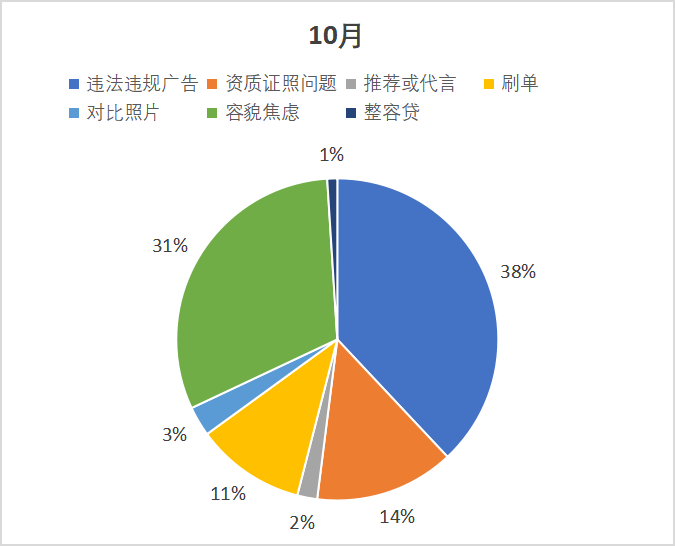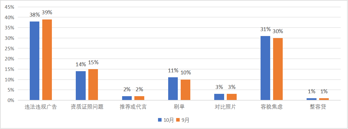 10月,制造违法违规广告、容貌焦虑、资质证照问题占据前三位。与上月相比,违法违规广告、资质证照问题有所减少,刷单问题、容貌焦虑问题有所增加;