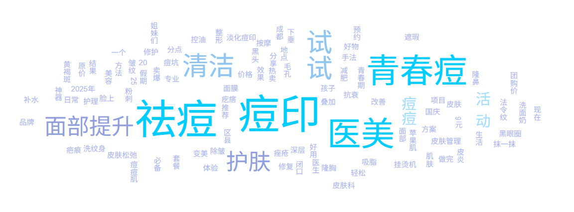 本报告期内,与面部项目推荐、痘肌、口碑等相关的词热度较高,具体如下(字号越大,热度越高):