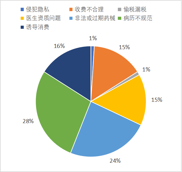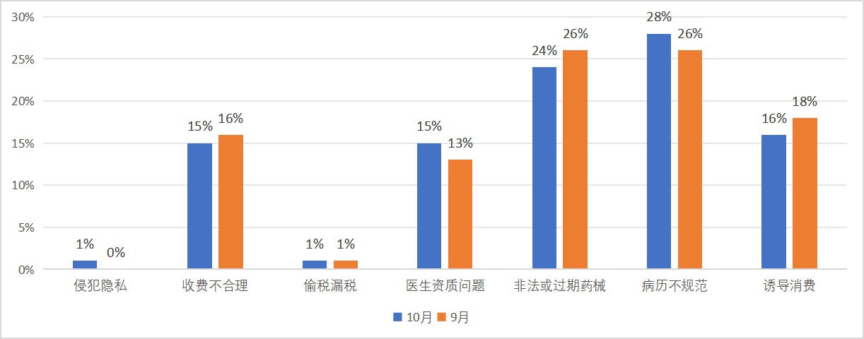 与上月相比,侵犯隐私、医生资质问题、病历不规范问题略有上升,收费不合理、非法或过期器械、诱导消费问题有所下降。