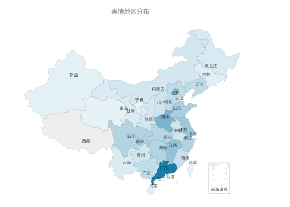 舆情分布区域Top10: 广东、河南、北京、江西、上海、江苏、山东、重庆、浙江、四川。
