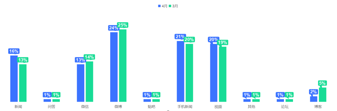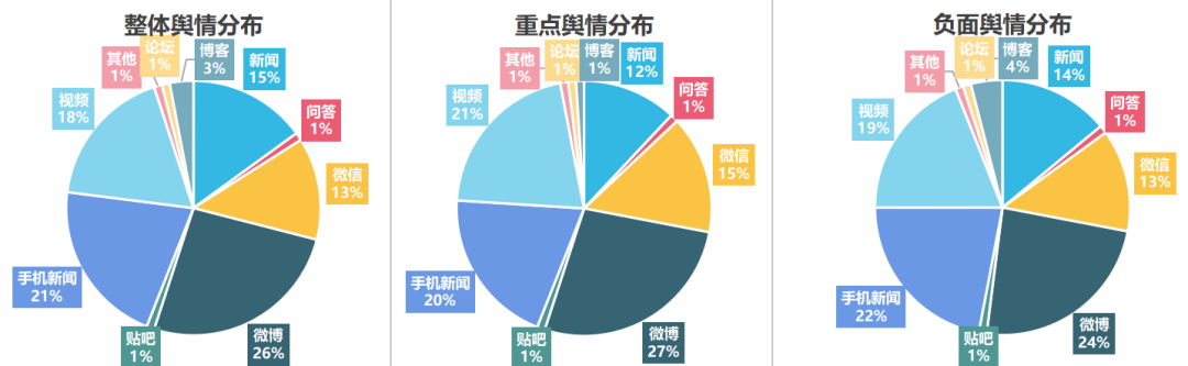 从总体舆情来源(平台)分布来看,微博、视频、手机新闻本月占比较大;重点舆情中,视频、微博、手机新闻媒体合计传播占比60%。负面舆情方面,微博、手机新闻、视频信息量占比相对较大。