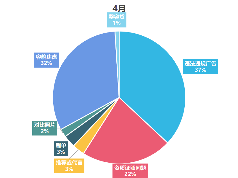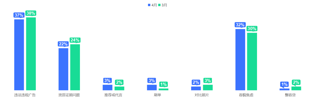 4月,制造违法违规广告、容貌焦虑、资质证照问题占据前三位。与上月相比,违法违规广告、容貌焦虑类问题有所减少;