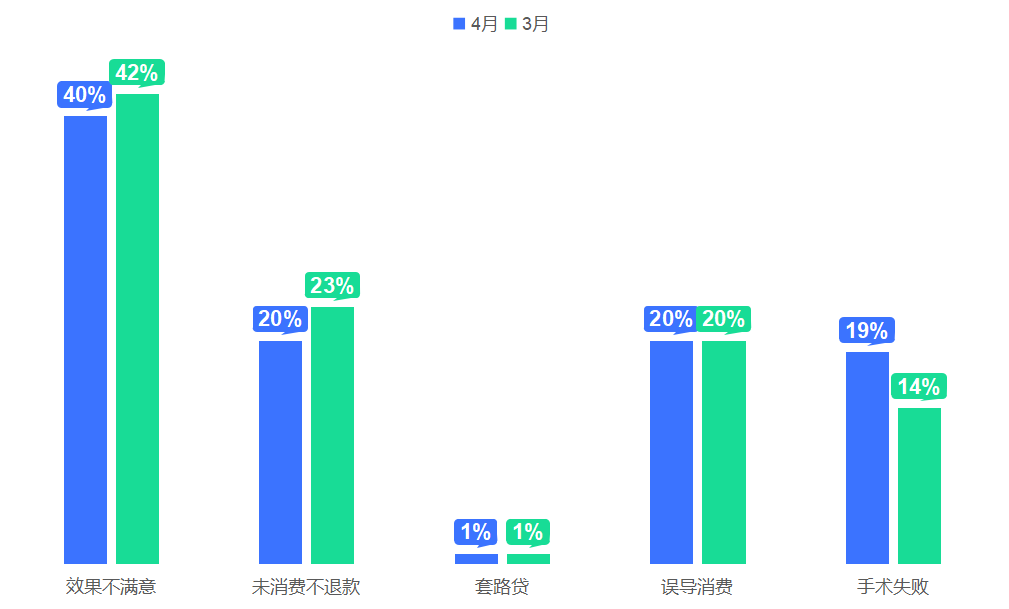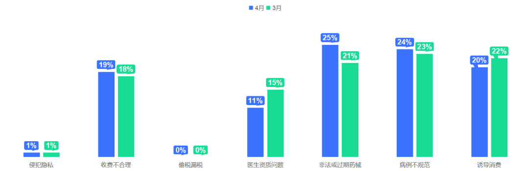 与上月相比,病例不规范、非法或过期药械、收费不合理类问题略有上升,诱导消费、医生资质类问题有所下降。