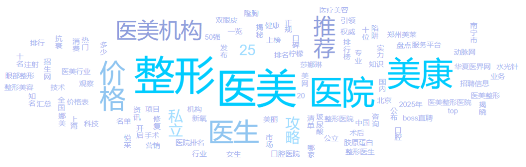 本报告期内,与项目推荐、各地医院排名、口碑、价格等相关的词热度较高,具体如下(字号越大,热度越高):