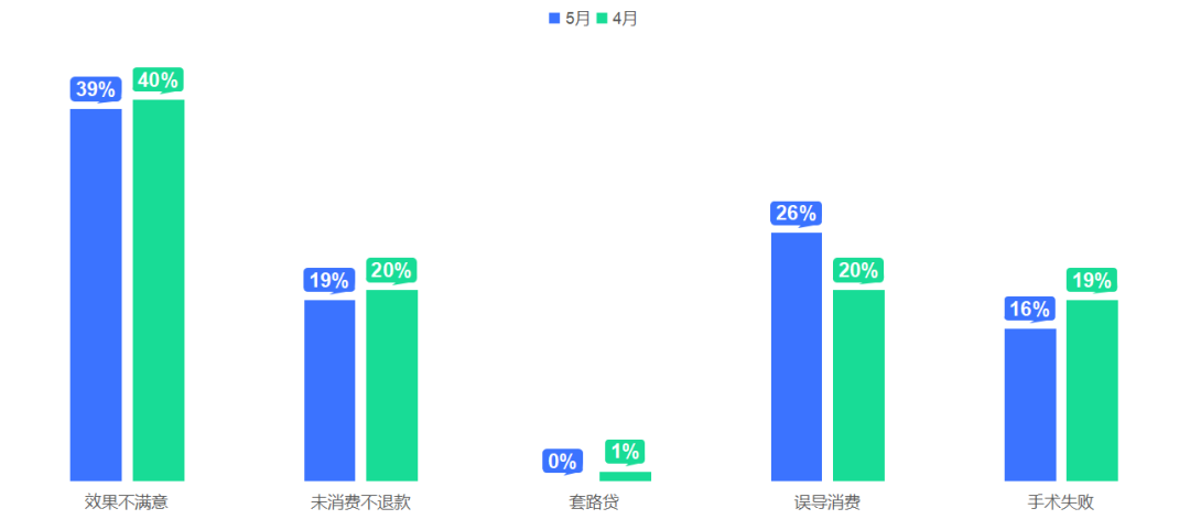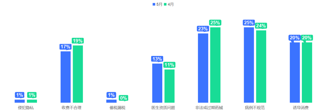 与上月相比,病例不规范、非法或过期药械、收费不合理类问题略有上升,诱导消费、医生资质类问题有所下降。