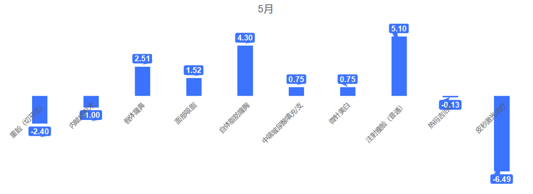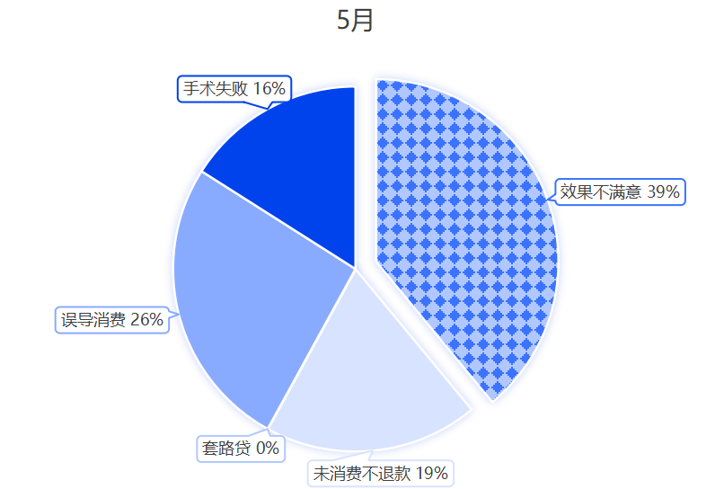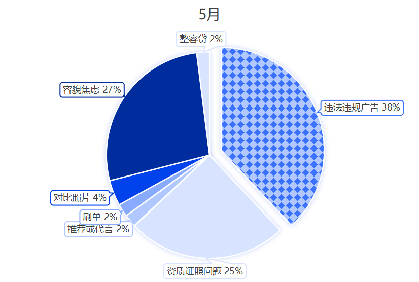 5月,制造违法违规广告、容貌焦虑、资质证照问题占据前三位。与上月相比,容貌焦虑类问题有所减少,违法违规广告、资质证照类问题有所增加;