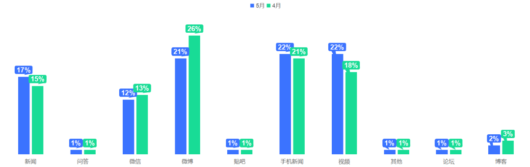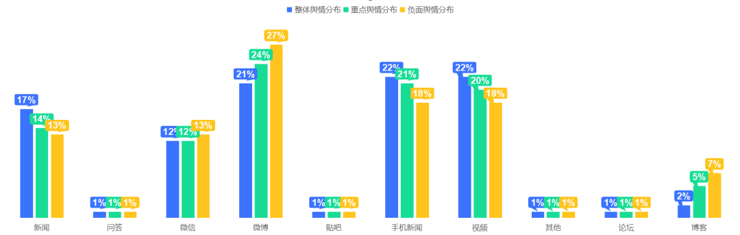 从总体舆情来源(平台)分布来看,微博、视频、手机新闻本月占比较大;重点舆情中,视频、微博、手机新闻媒体合计传播占比65%。负面舆情方面,微博、手机新闻、视频信息量占比相对较大。