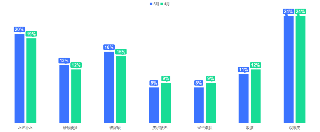 同比上期,水光补水、除皱瘦脸、玻尿酸销量有所上升。