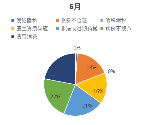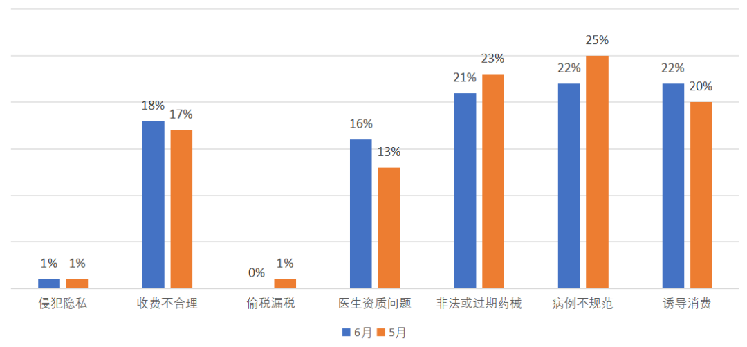 与上月相比,收费不合理类、医生资质类问题略有上升,偷税漏税、非法或过期药械、病例不规范、诱导消费类问题有所下降。