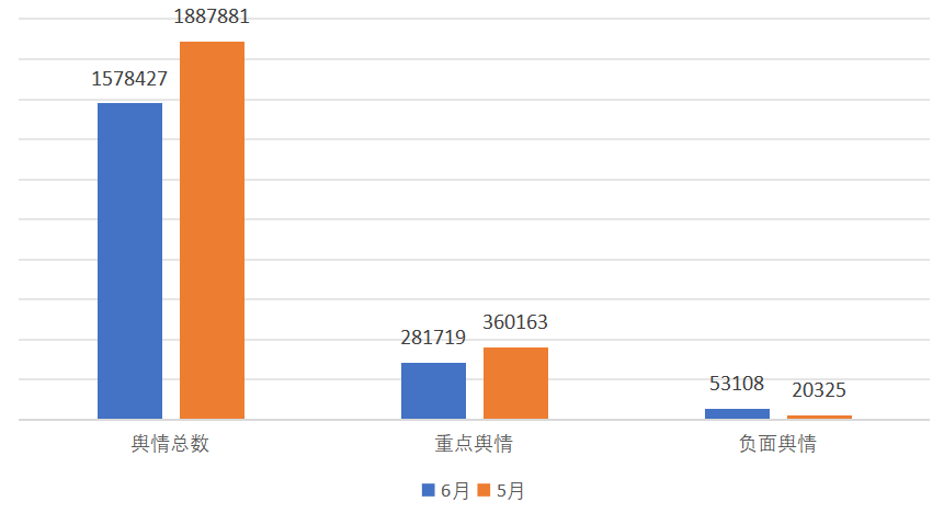 2025年6月1日至6月30日,全网新增医疗美容相关信息共计 1578427条。其中重点媒体频道信息281719条,占总体信息量的21%,负面信息量53108条,占总体信息量的0.1%,与上期相比,总信息量和重点媒体信息量有所减少,负面信息量有所增加。