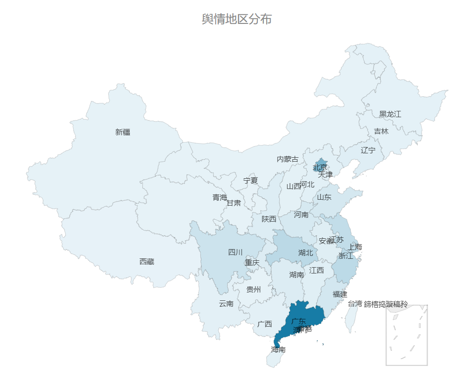 舆情分布区域Top10: 广东、北京、湖北、浙江、江苏、上海、四川、福建、山东、河南。