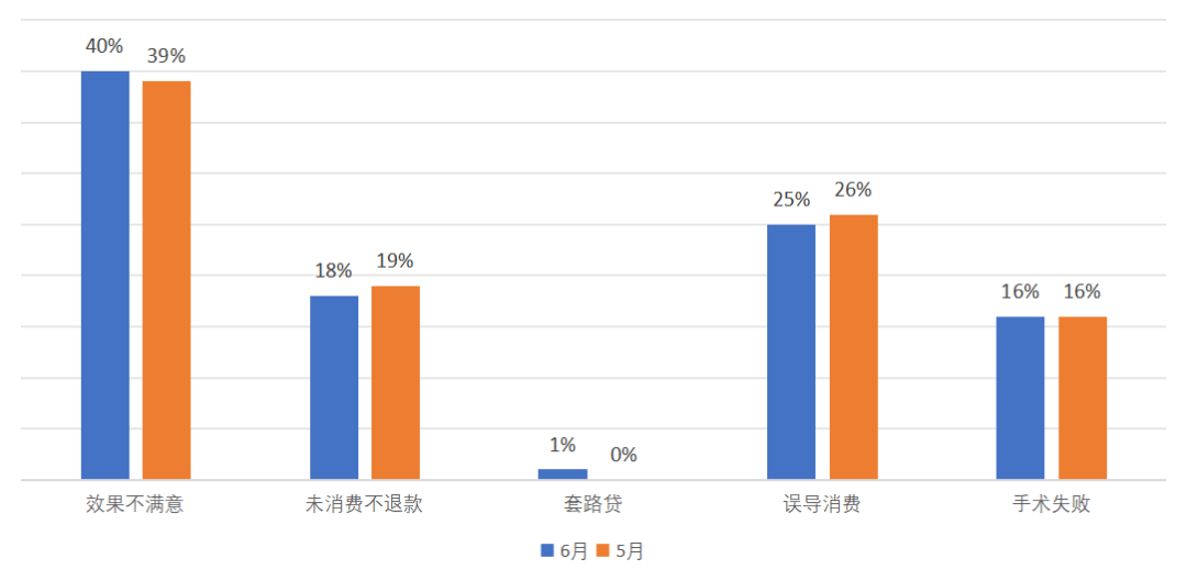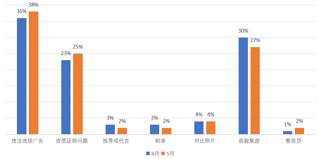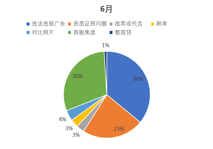 6月,制造违法违规广告、容貌焦虑、资质证照问题占据前三位。与上月相比,违法违规广告、资质证照类问题有所减少,容貌焦虑问题有所增加;