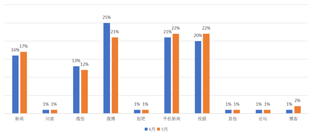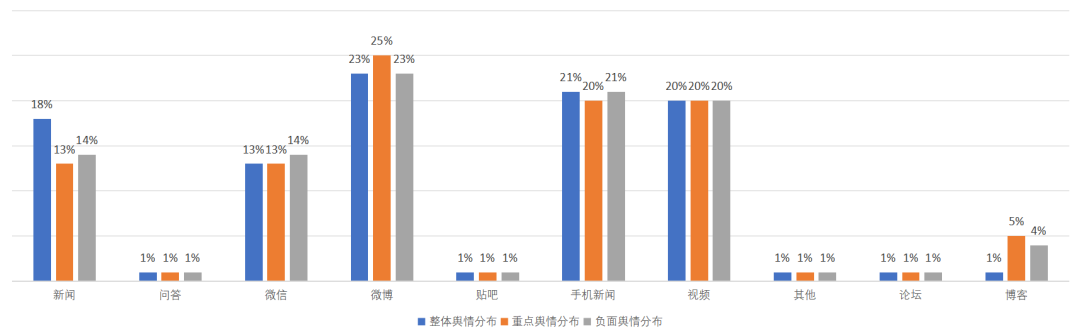 从总体舆情来源(平台)分布来看,微博、视频、手机新闻本月占比较大;重点舆情中,视频、微博、手机新闻媒体合计传播占比65%。负面舆情方面,微博、手机新闻、视频信息量占比相对较大。