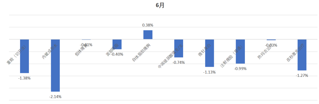 根据北京、上海、广东、深圳、浙江、重庆等地6月份的网络价格监测数据,部分常见项目的均价环比变化如下(单位:元)。